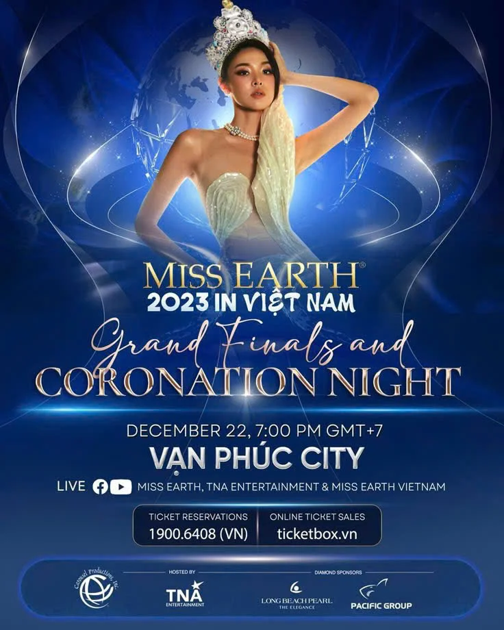 Bình chọn Mỹ nhân của năm (Bảo Ngọc): Poster kêu gọi bình chọn cho Hoa hậu Bảo Ngọc với phong cách thiết kế trong trẻo, sử dụng tông màu xanh Crystal và hiệu ứng lấp lánh. Bố cục tích hợp mã QR và hướng dẫn bình chọn 3 bước trực quan, tối ưu cho tương tác trên mạng xã hội. Miss Earth 2023 (Chung kết): Poster chính thức cho đêm Chung kết và Đăng quang Miss Earth 2023 tại Vạn Phúc City. Thiết kế mang tầm vóc quốc tế với tông xanh hoàng gia, kết hợp hình ảnh vương miện và quả địa cầu biểu tượng, thể hiện sự sang trọng và quy mô của sự kiện.